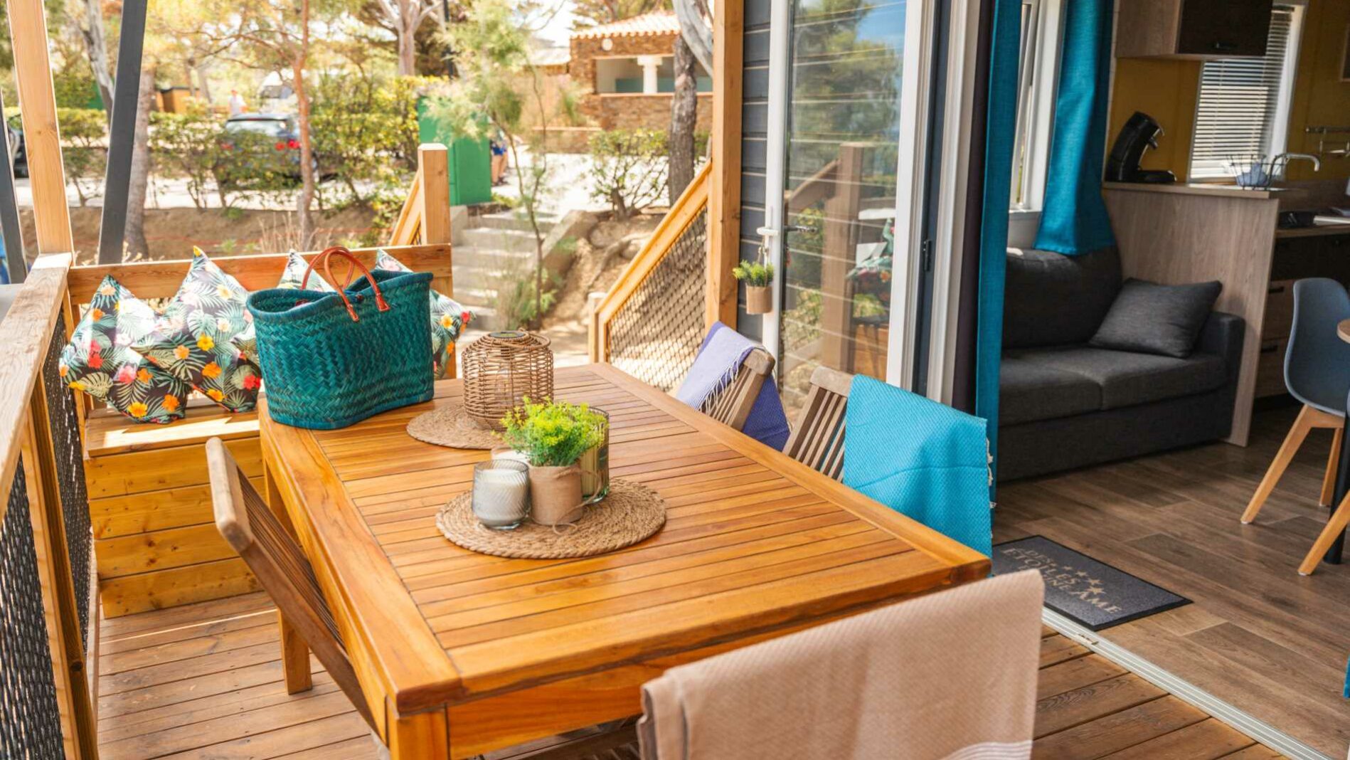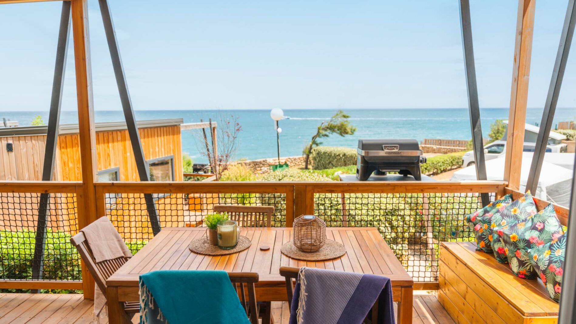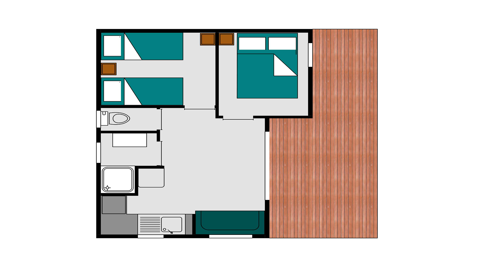 27 m² + Terrassa coberta, una habitació amb llit de matrimoni (140×190), una habitació amb 3 llits simples (80×190) inclòs 1 llitera. Un saló i una cuina equipada. Una sala de bany amb lavabos, dutxa i WC. Mobles de jardí de fusta. Aire acondicionat a l’habitació dels pares.