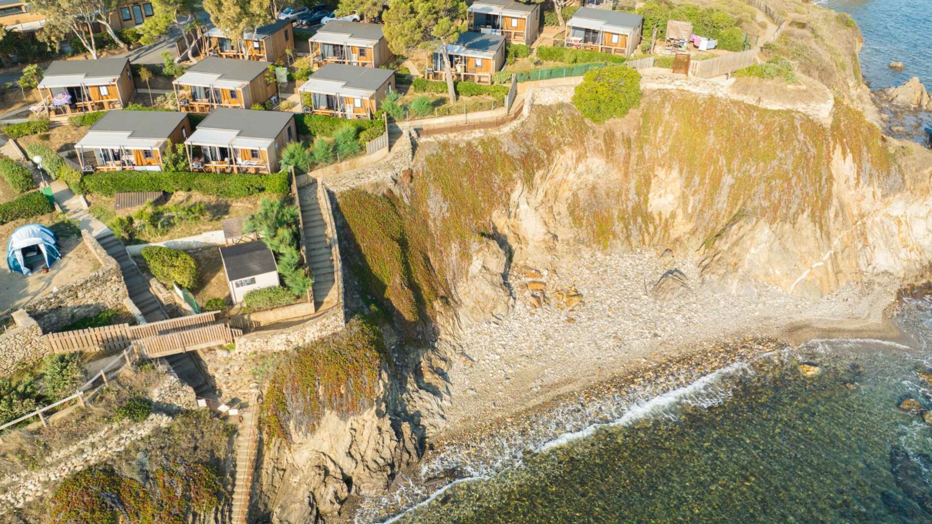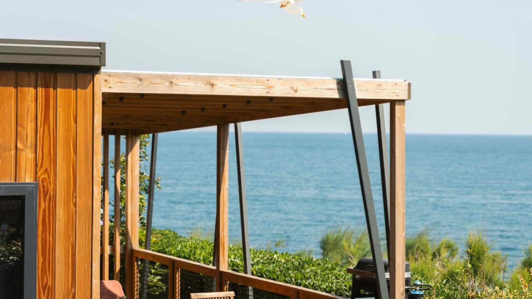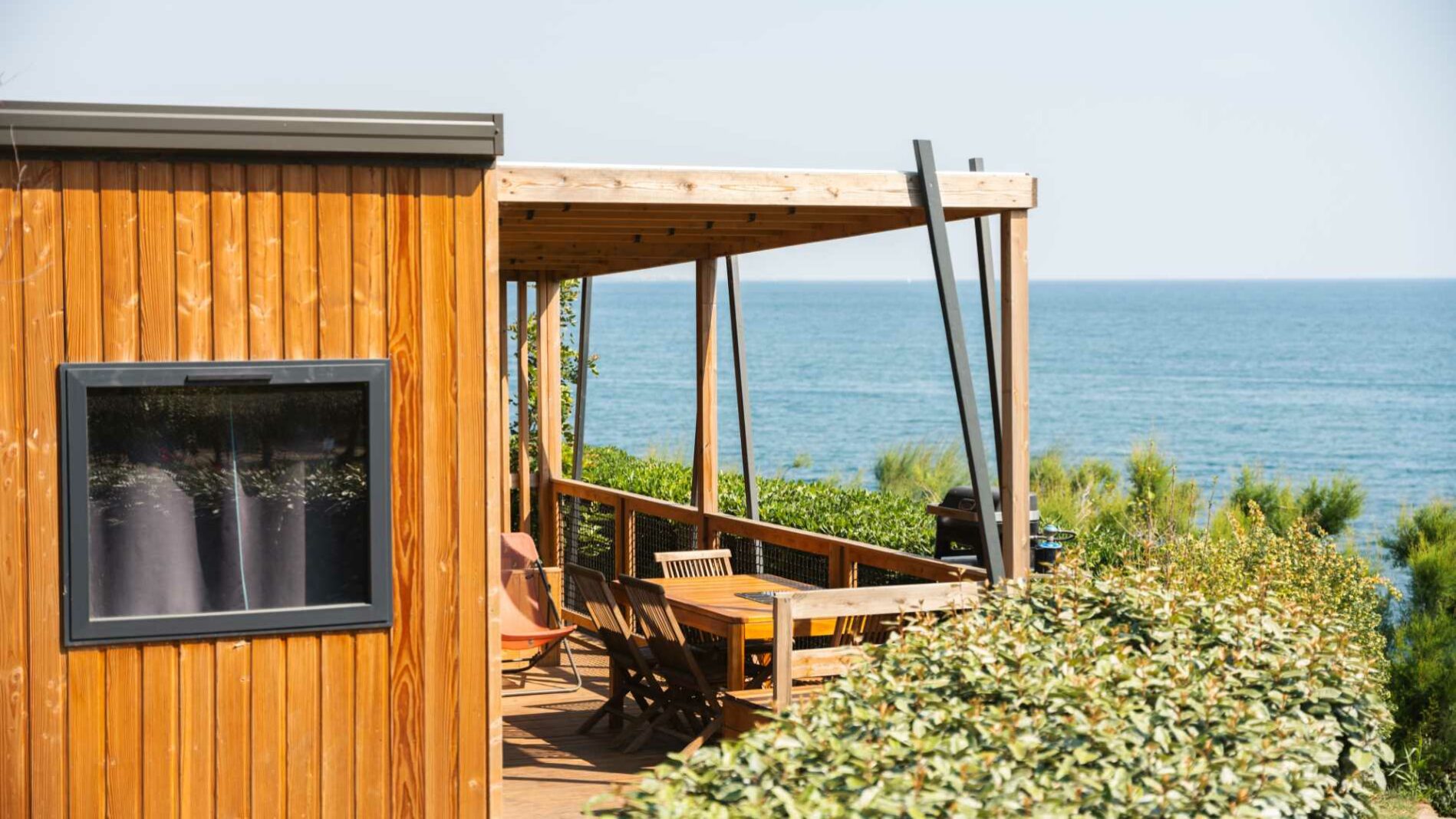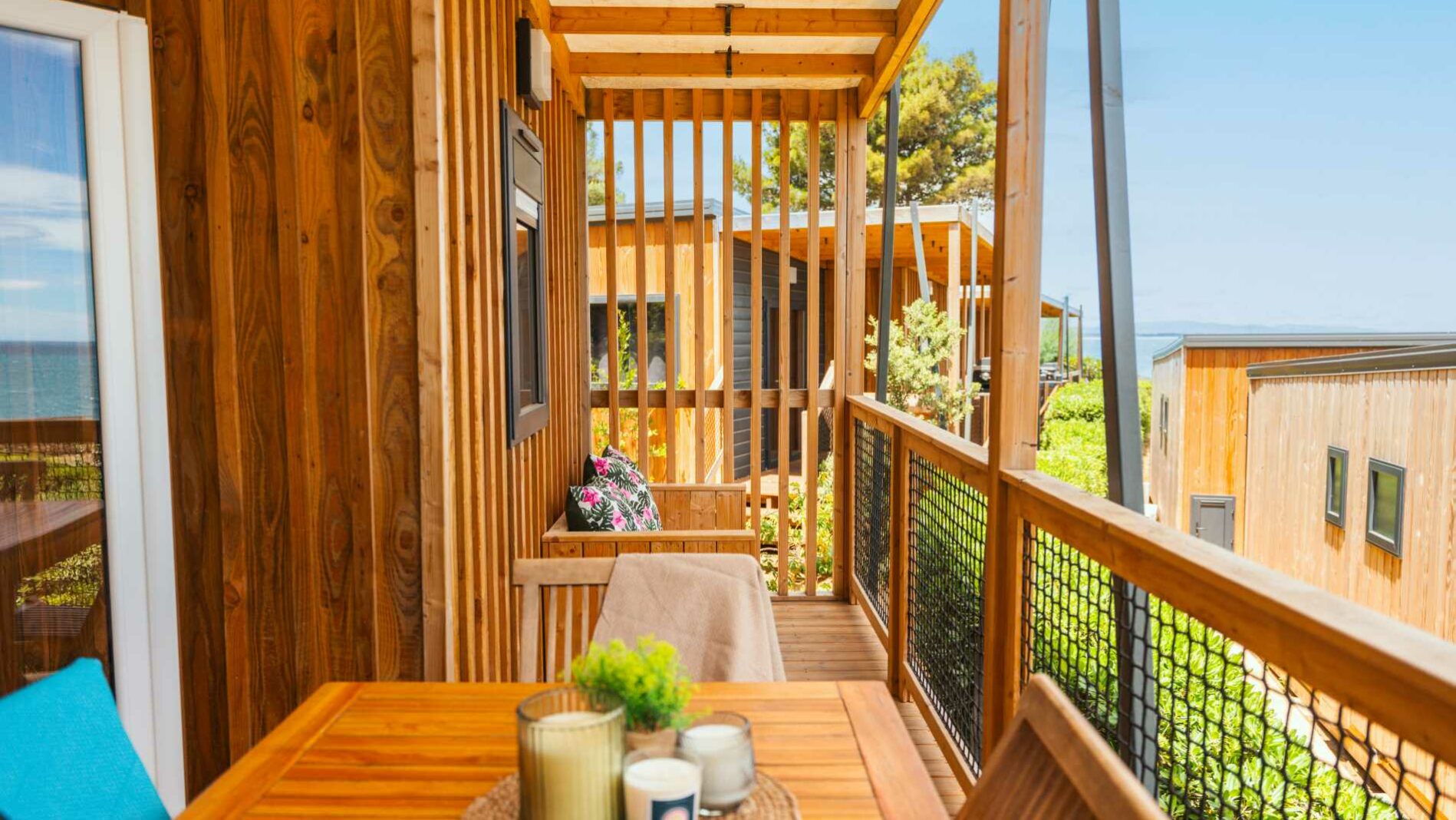 27 m² + Terrassa coberta, una habitació amb llit de matrimoni (140×190), una habitació amb 3 llits simples (80×190) inclòs 1 llitera. Un saló i una cuina equipada. Una sala de bany amb lavabos, dutxa i WC. Mobles de jardí de fusta. Aire acondicionat a l’habitació dels pares.