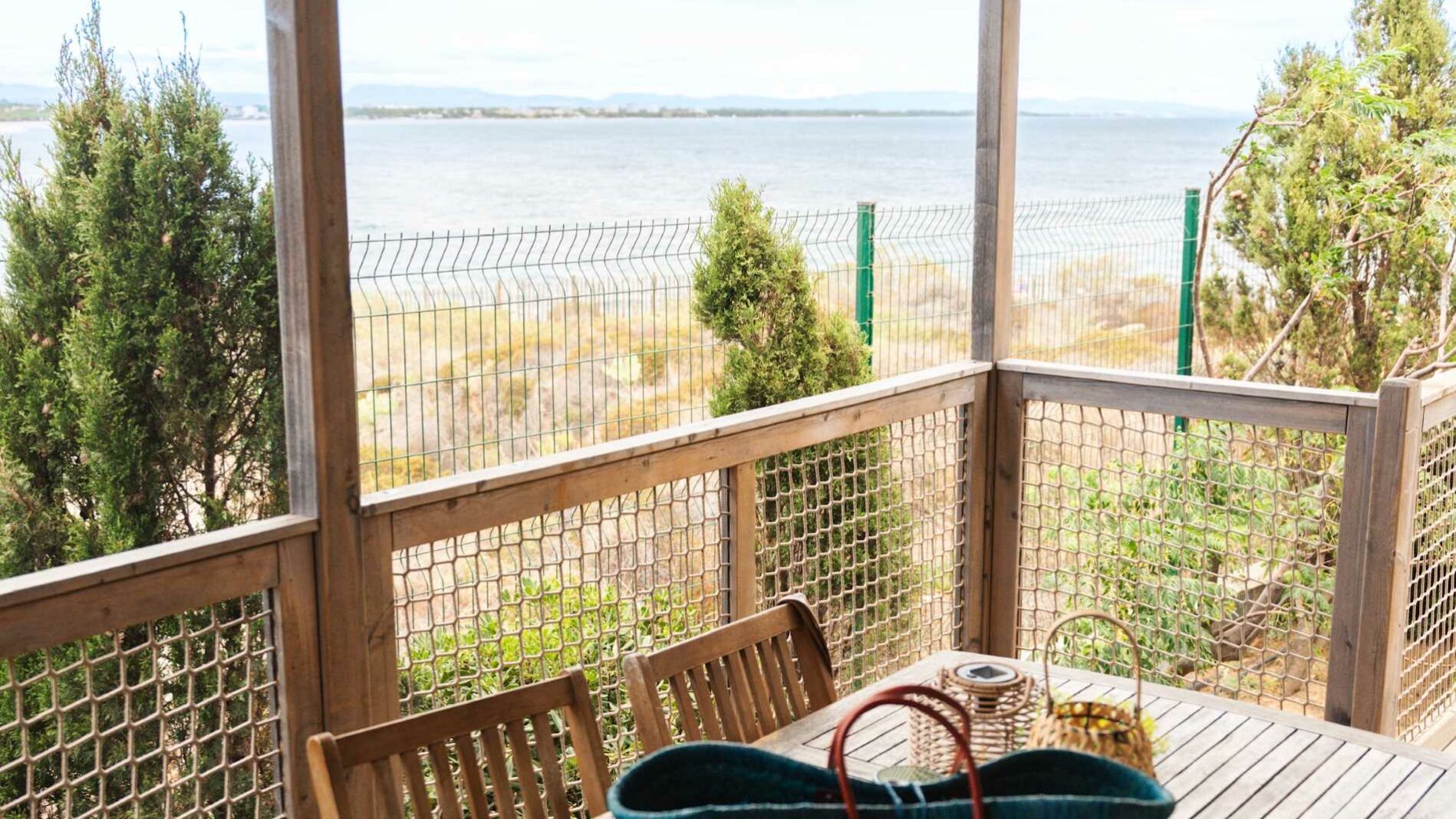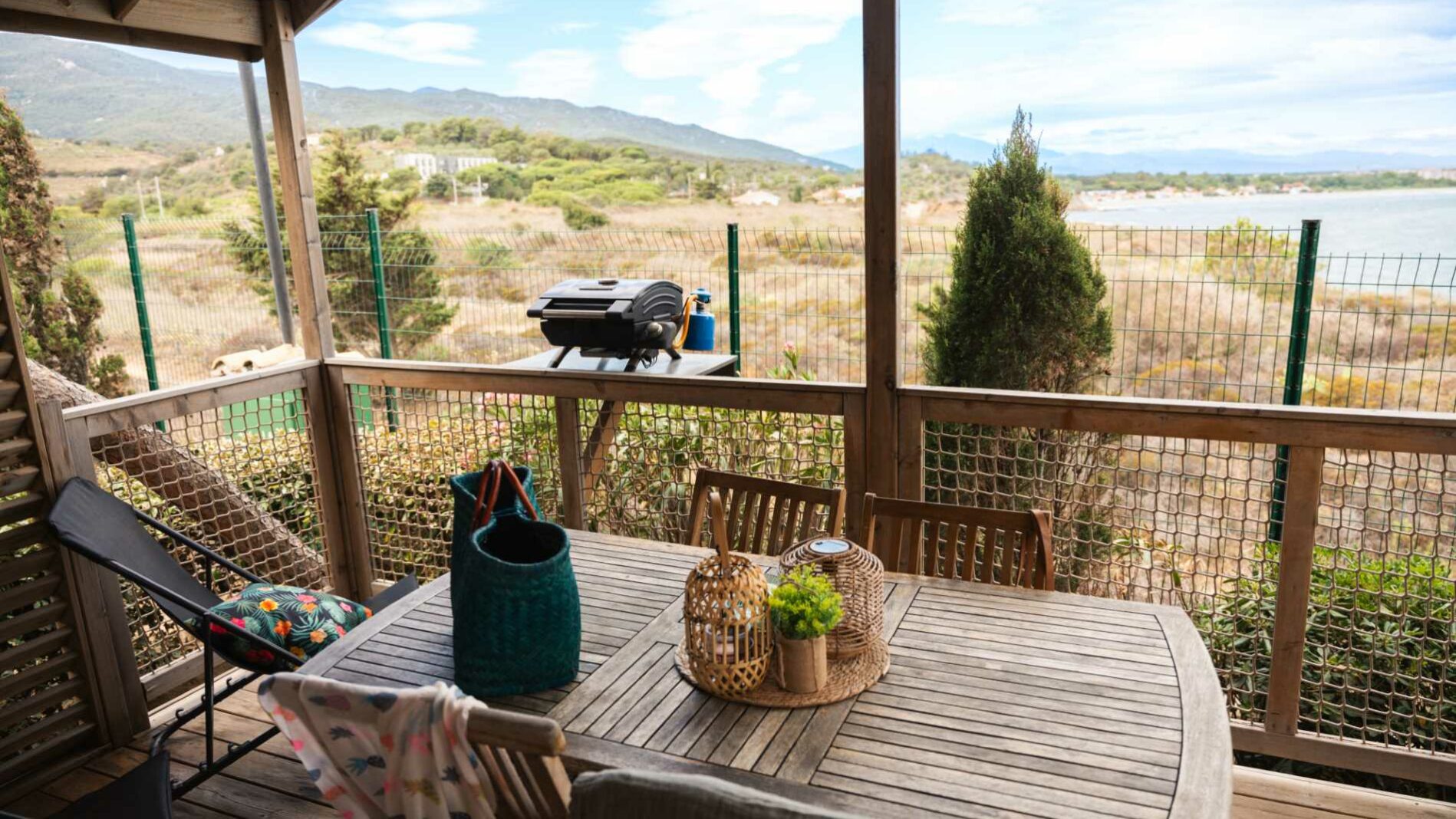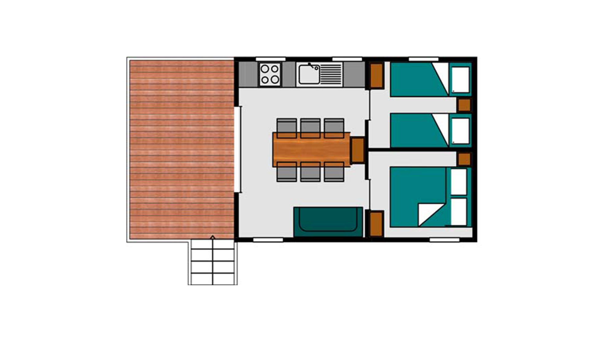 24 m² + 10 m² De terrassa coberta, una cambra amb un llit doble (140×190). Una cambra amb dos llits simples (80×190) . Un racó saló amb un sofà convertible per dues persones (140×190). Una cuina equipada.Mobles de jardí de fusta.