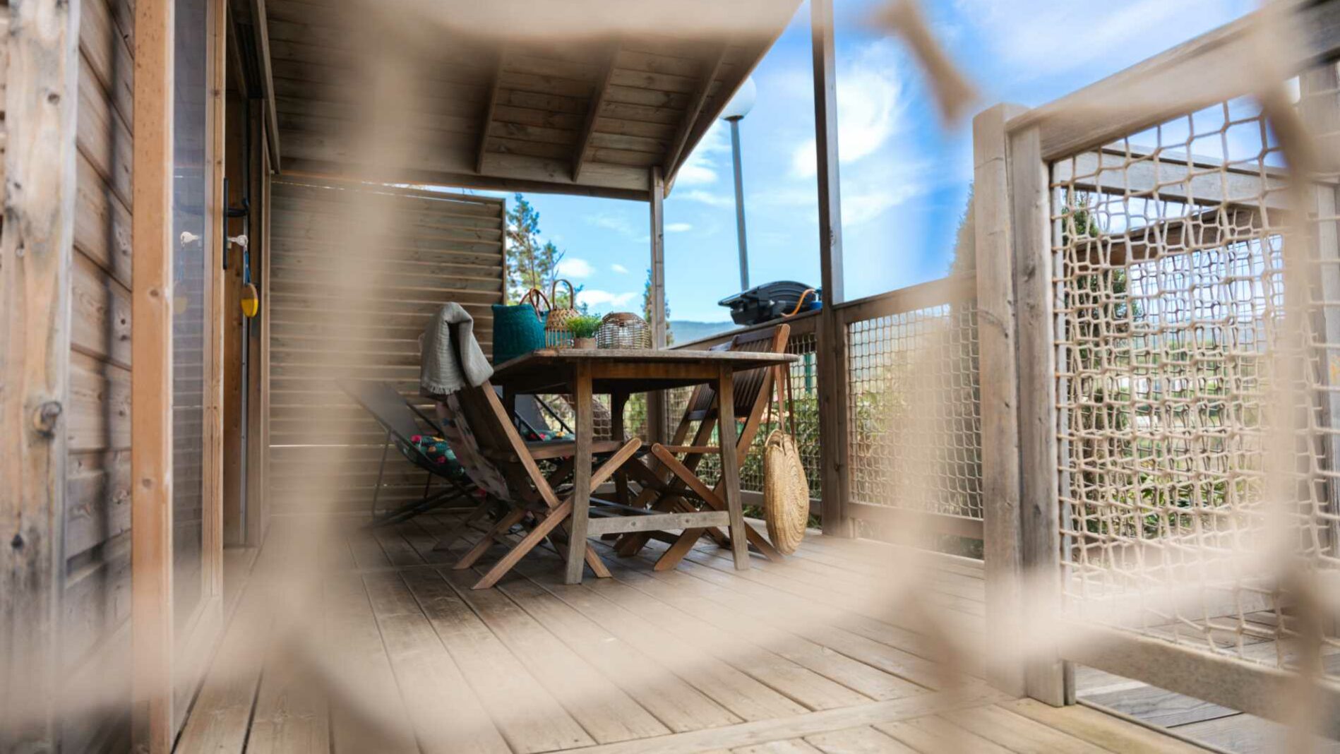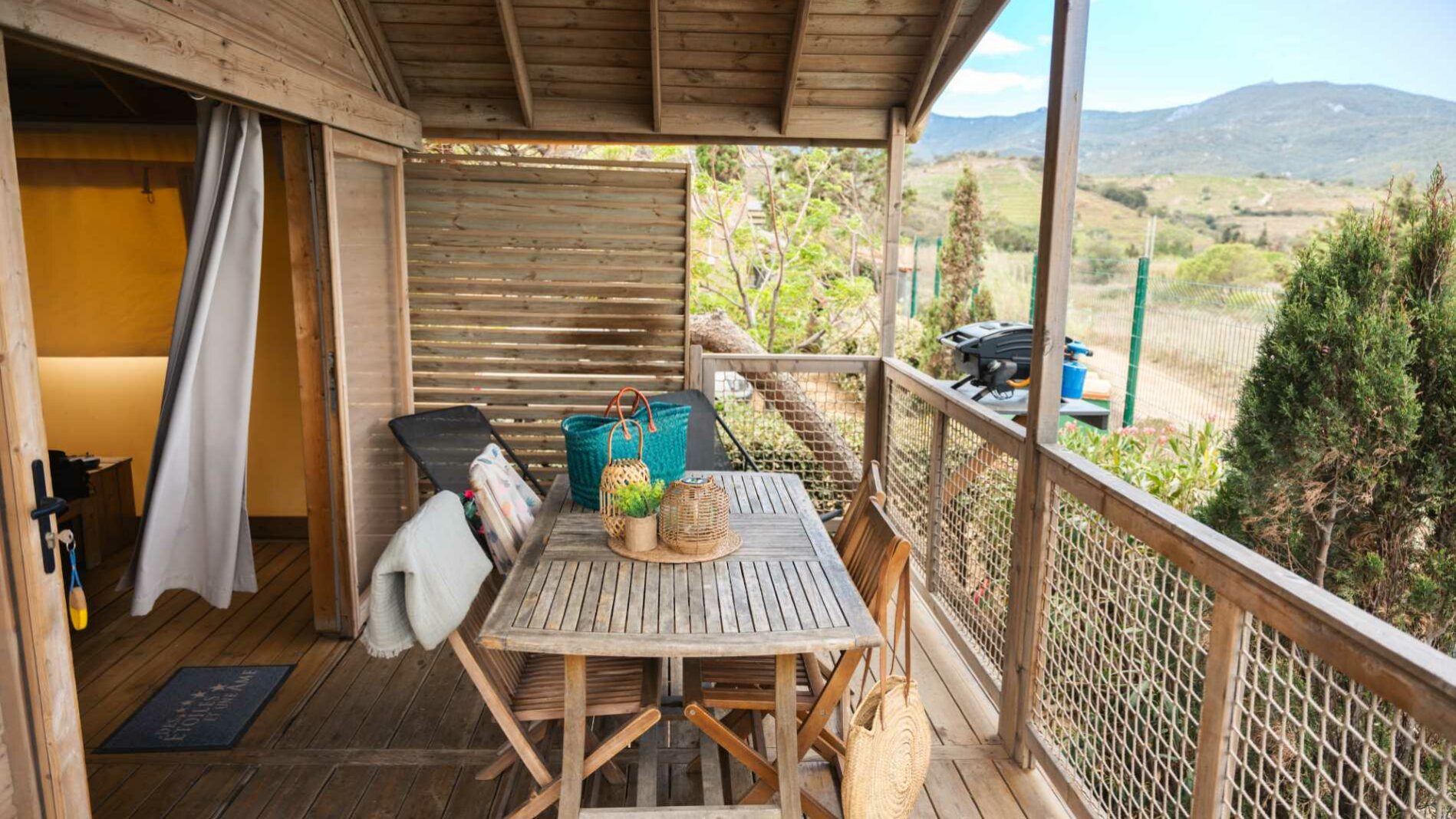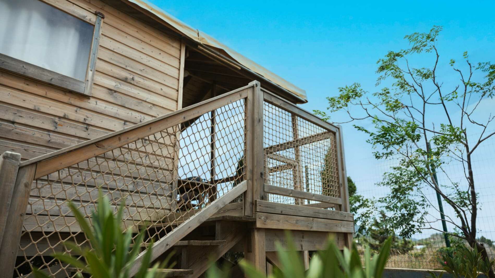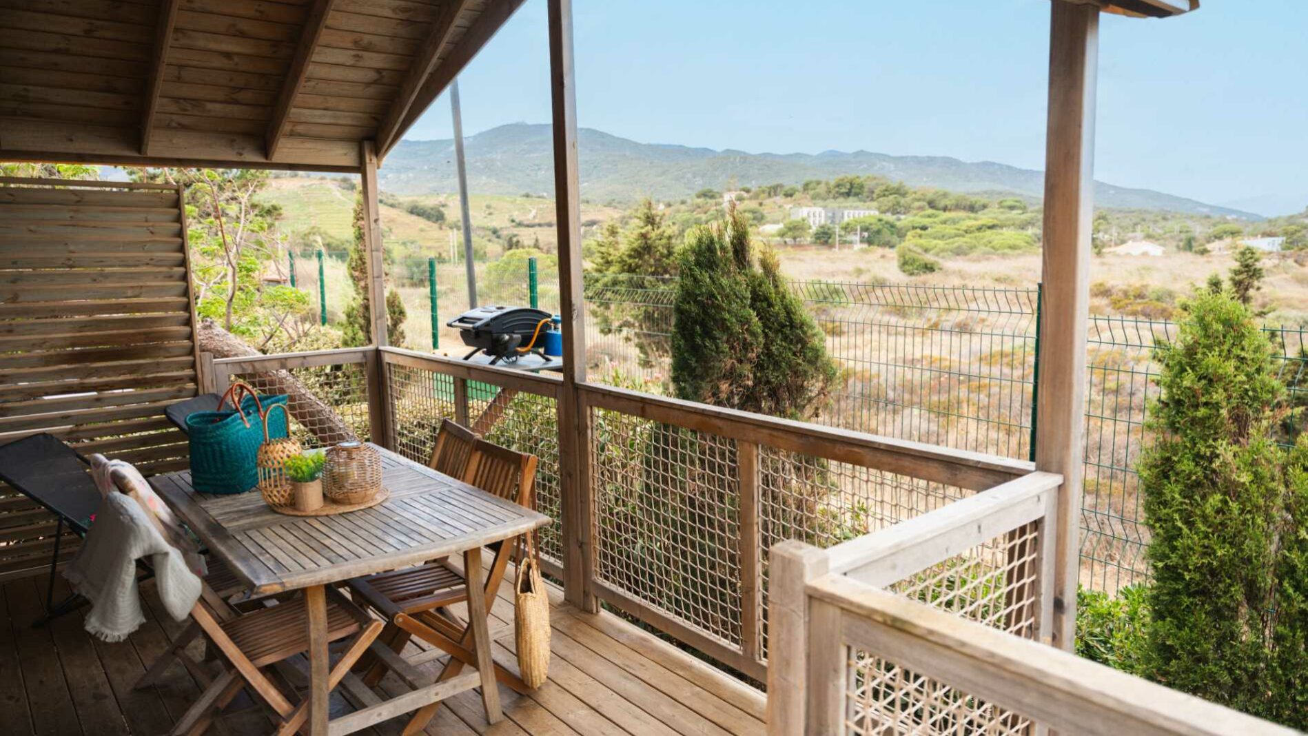 24 m² + 10 m² De terrassa coberta, una cambra amb un llit doble (140×190). Una cambra amb dos llits simples (80×190) . Un racó saló amb un sofà convertible per dues persones (140×190). Una cuina equipada.Mobles de jardí de fusta.