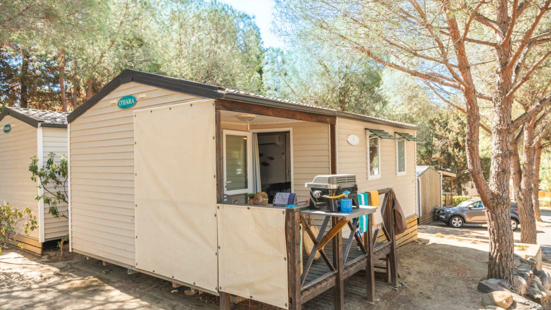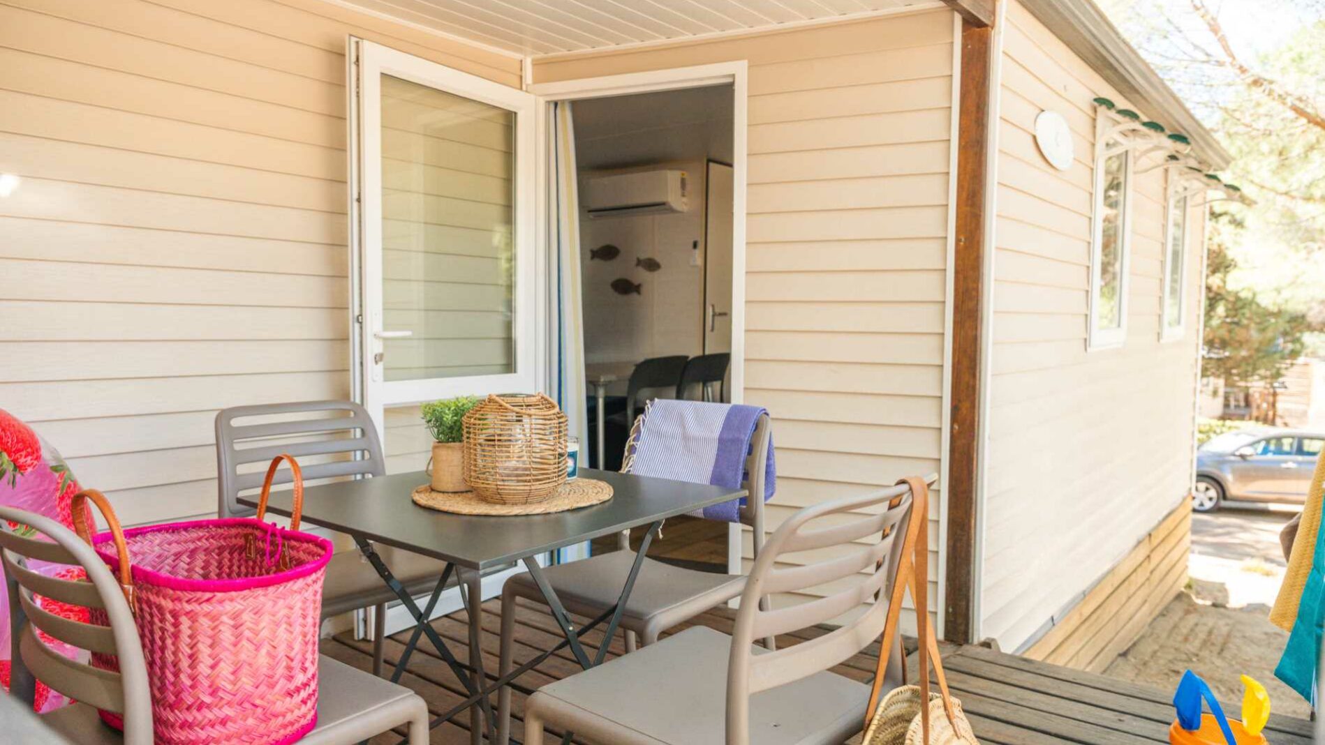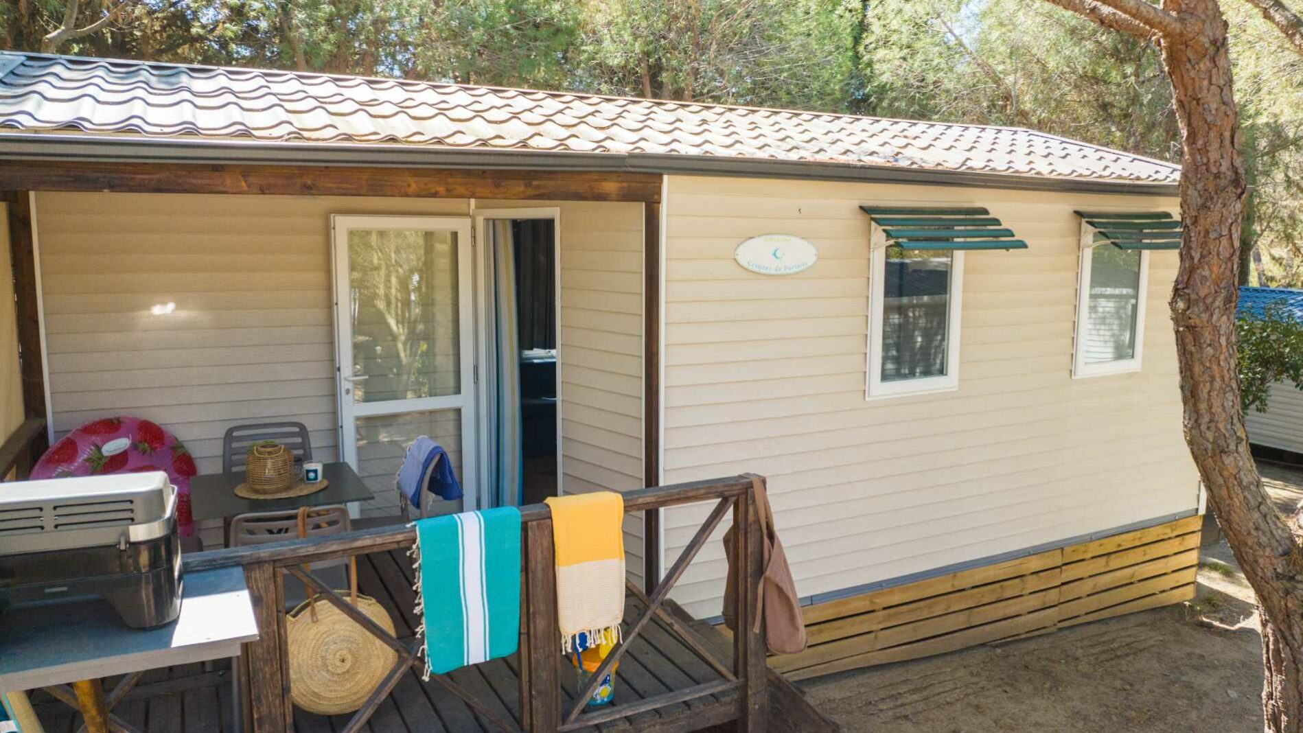 20 m² + 7 m² terrassa coberta, un habitació amb 1 llit doble (160 x 200), un habitació amb 2 llits simples (80 x 190), una racó àpat convertible en llit 2 persones (140 x 190) ; 1 cuina equipada. Una sala de bany amb lavabos, dutxa i WC. Mobles de jardí.
